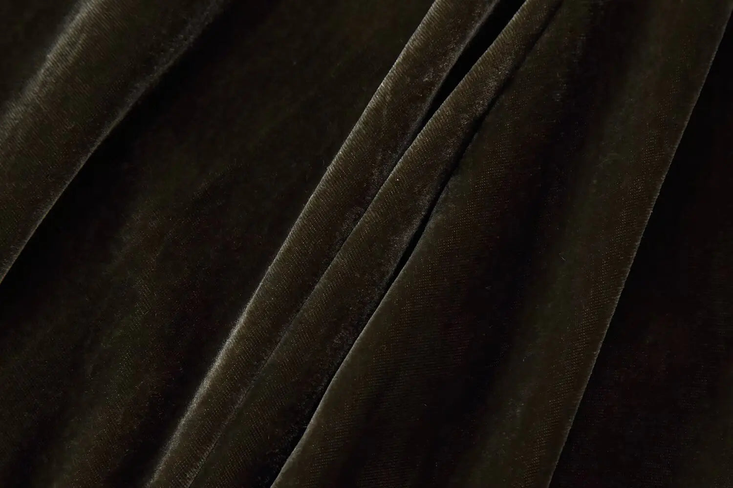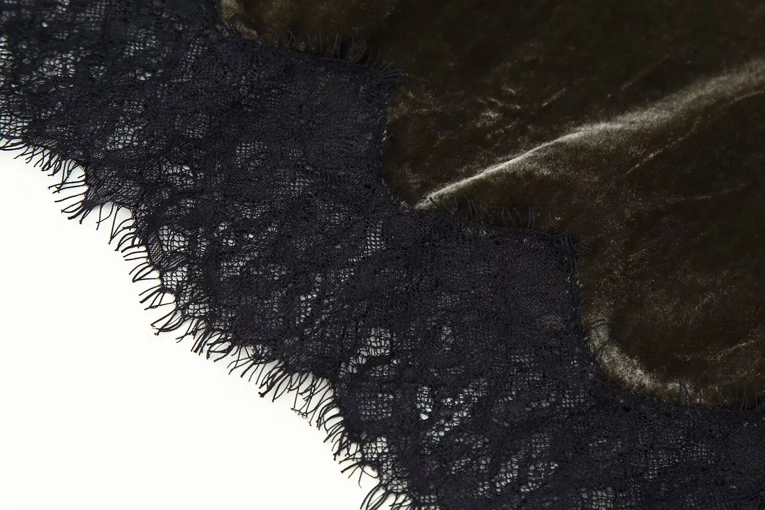 The Aroni skirt is a sophisticated velvet maxi skirt with a unique double-layered design and delicate lace trim at the hem. It offers a graceful silhouette with a soft sheen and elegant drape, perfect for evening occasions or elevated daywear styling.