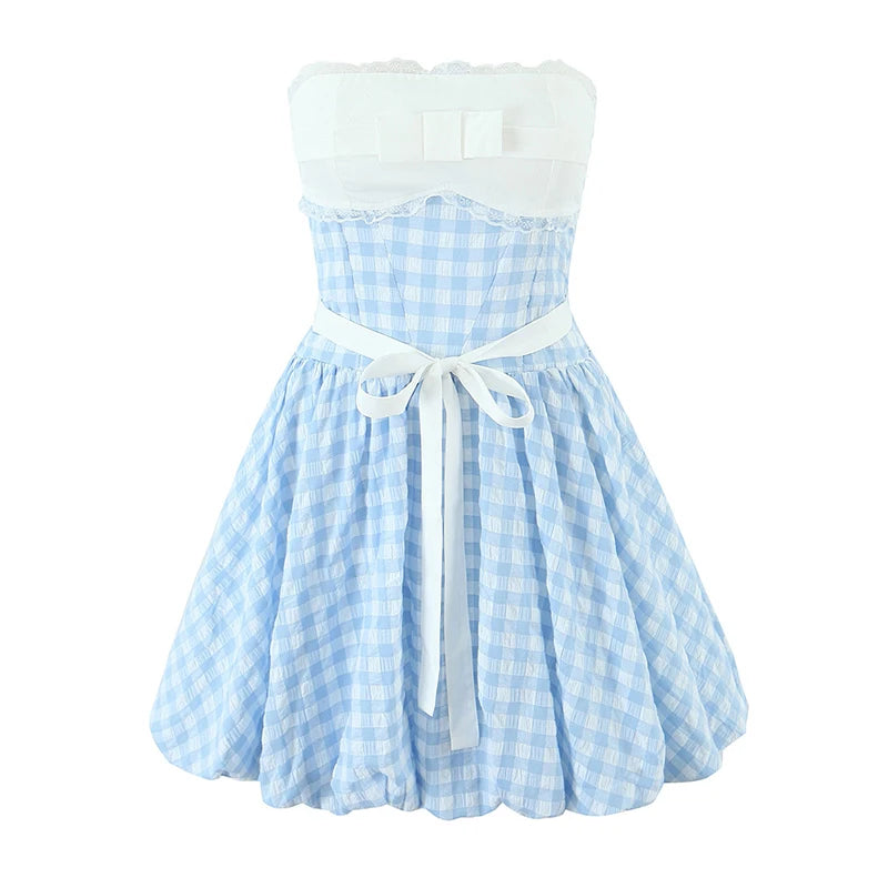 The Brie Dress is a playful take on classic summer style. This strapless mini features a crisp white bodice with a sweet bow detail, transitioning into a dreamy light blue gingham bubble skirt. The cinched white waist tie creates a perfect silhouette, making it an ideal choice for sunny afternoon picnics or brunch dates.