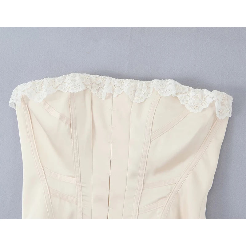 The Callum // Corset is a structured, strapless bustier featuring soft satin fabric, internal boning, and romantic lace trim along the neckline. Its hourglass silhouette and front pleated detailing add a vintage elegance that pairs beautifully with high-waisted trousers, skirts, or layered under a blazer for a more polished statement.
