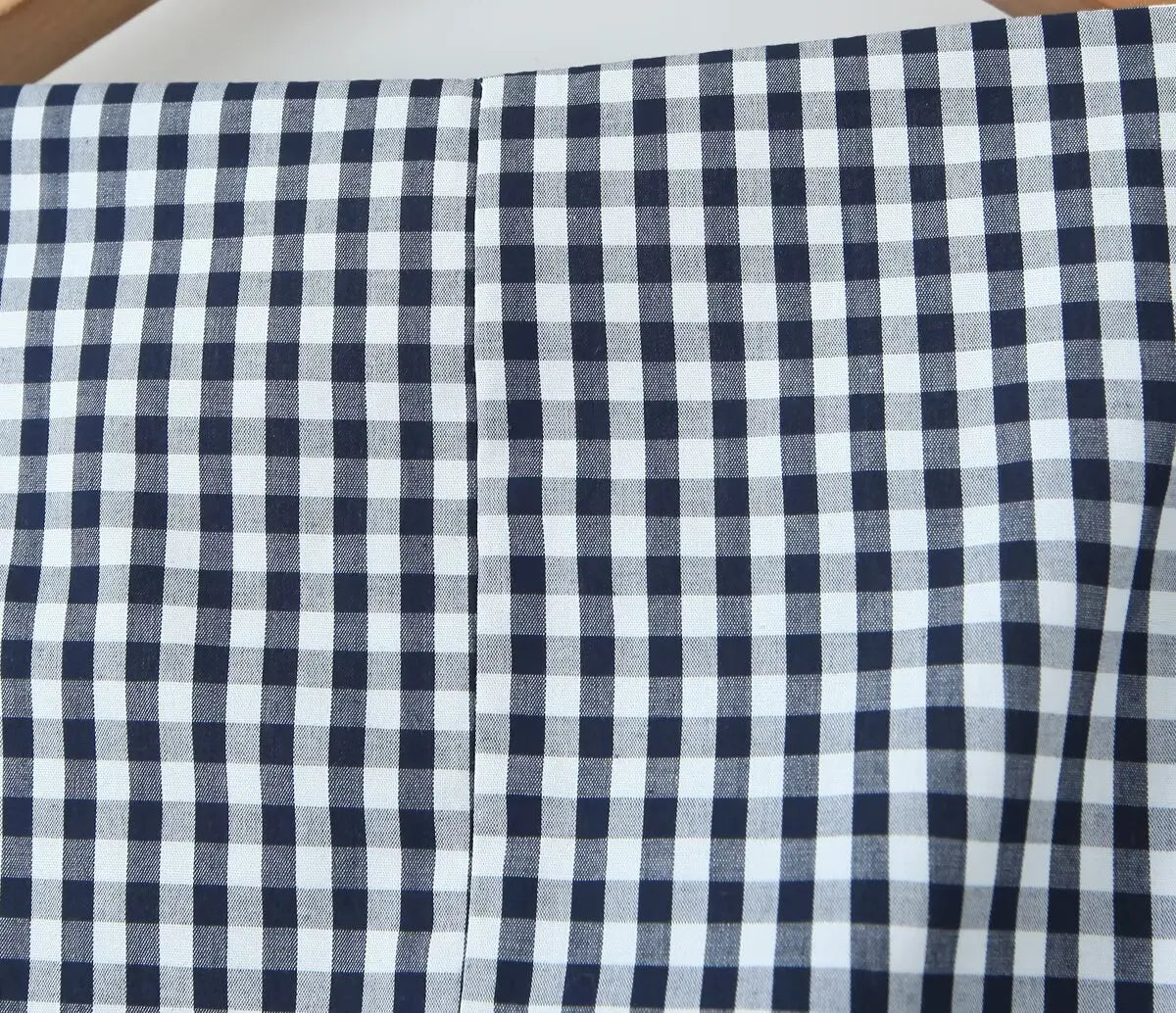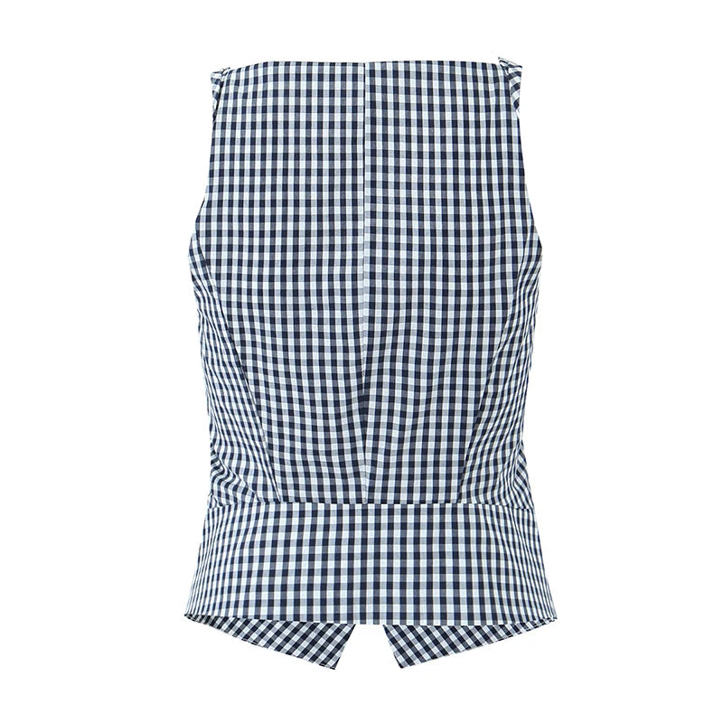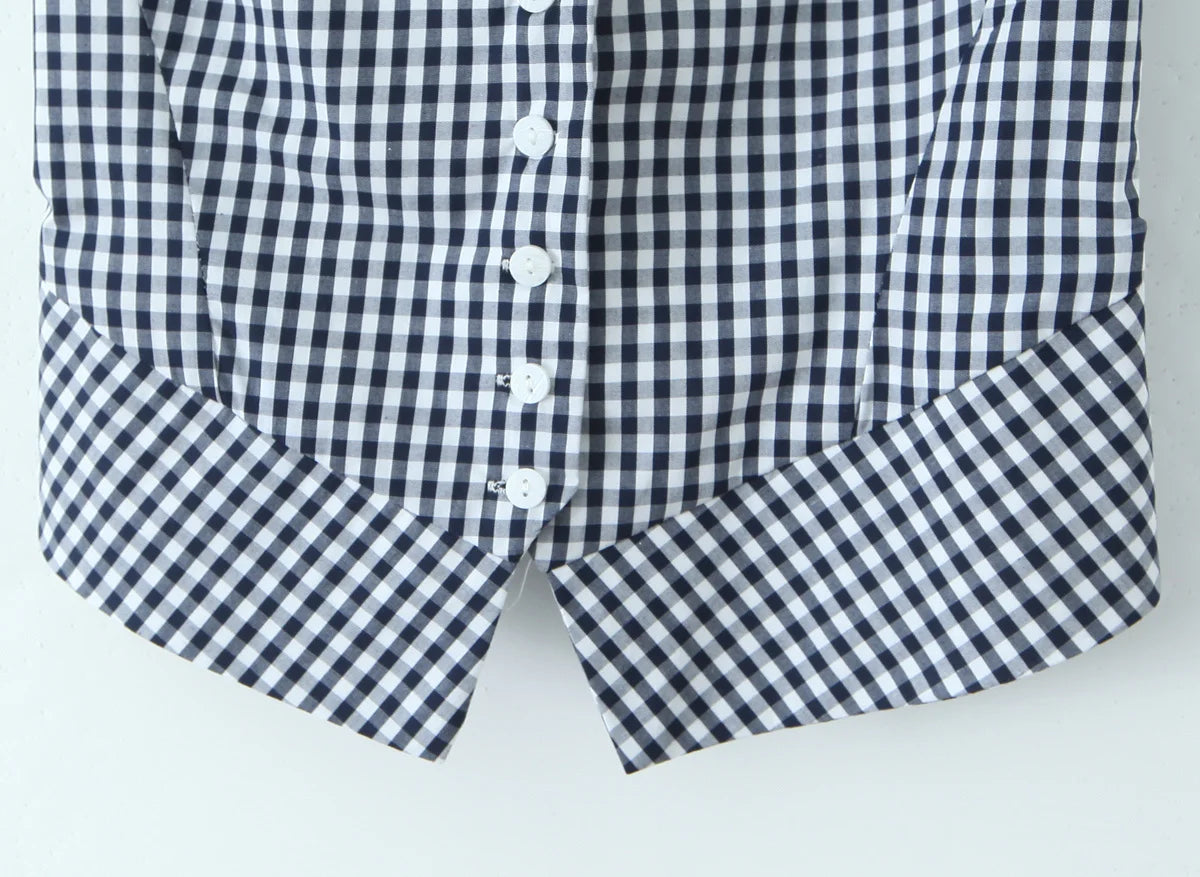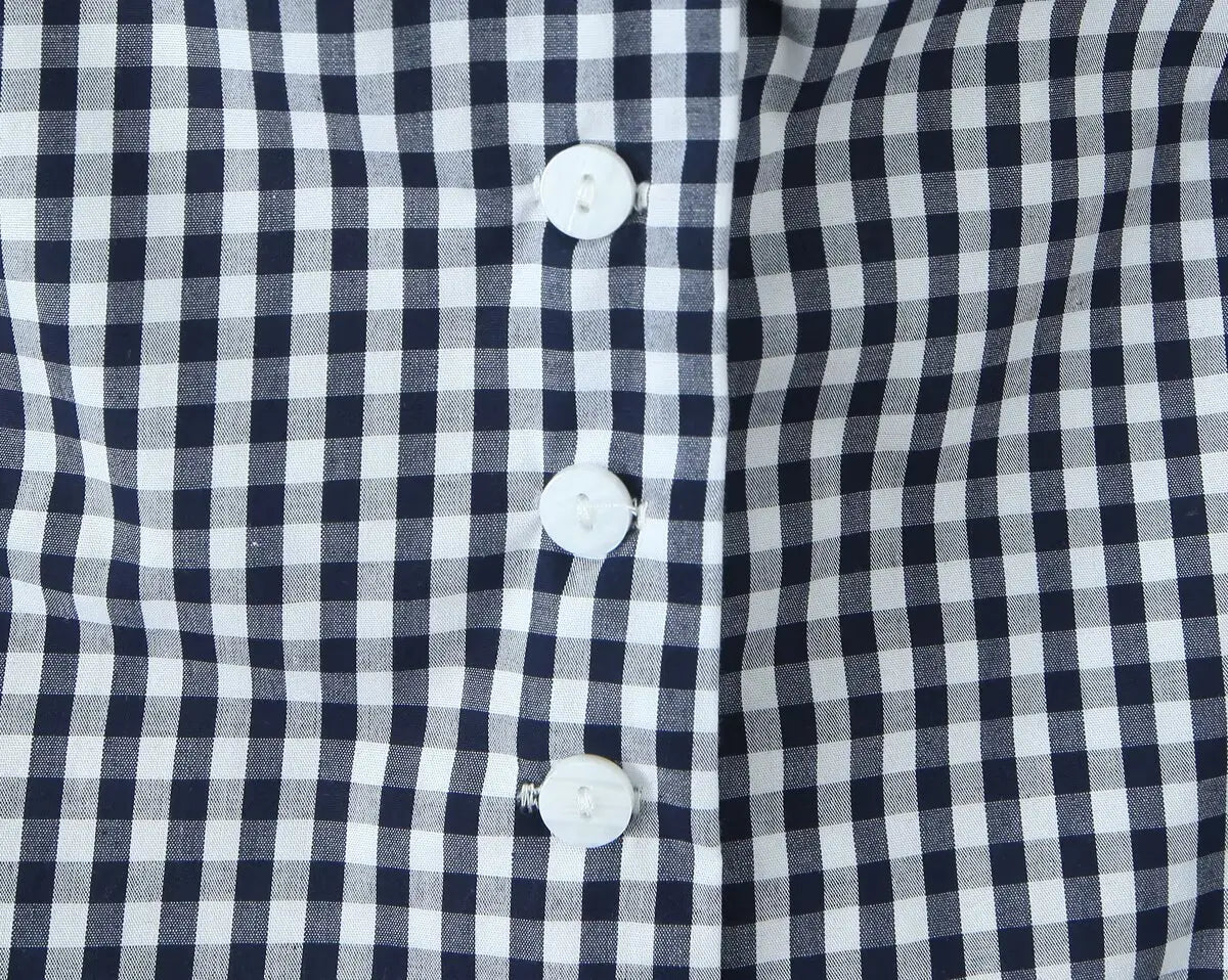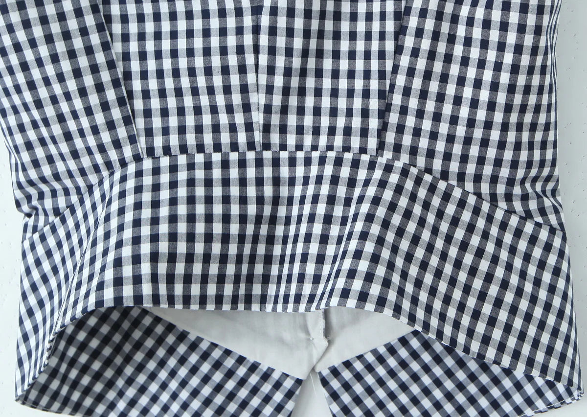 The Cora Top features a timeless gingham check pattern with a structured, button-up design. The V-neckline and tailored fit create a flattering silhouette, making it the perfect piece for a chic, casual look.