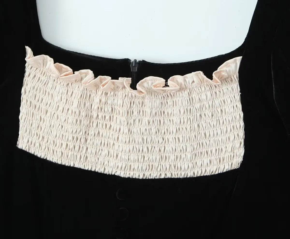 The Love Lounge dress is a romantic velvet mini dress featuring a smocked ivory bust, ruched puff sleeves, and contrast pleated trim at the hem. The soft texture and detailed silhouette make it ideal for elegant evenings and cozy, glamorous occasions.