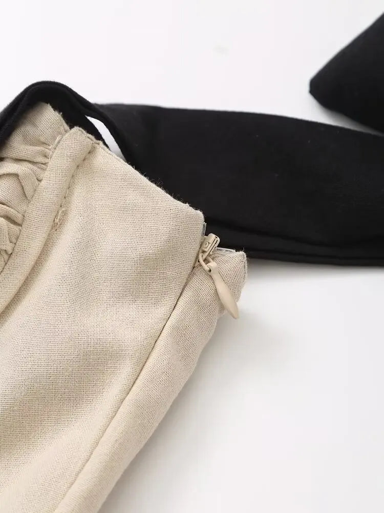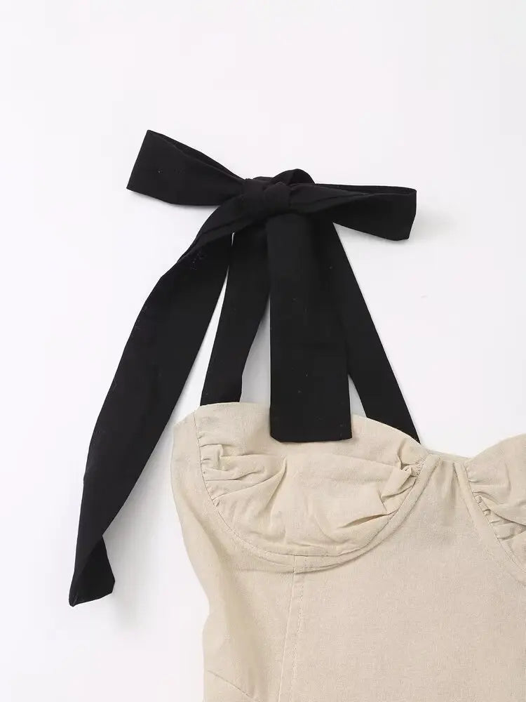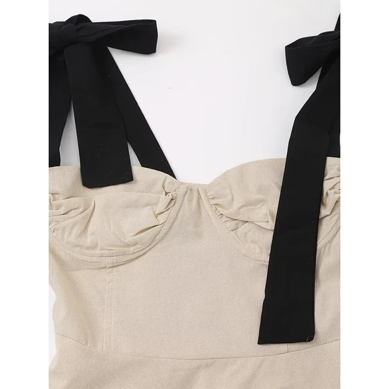 The Sonata // Dress is a soft A-line mini dress crafted in a neutral beige tone with contrast black shoulder bows for a striking, romantic look. The structured bustier bodice gives definition, while the flared skirt adds movement. Perfect for summer soirées or brunch with a twist.