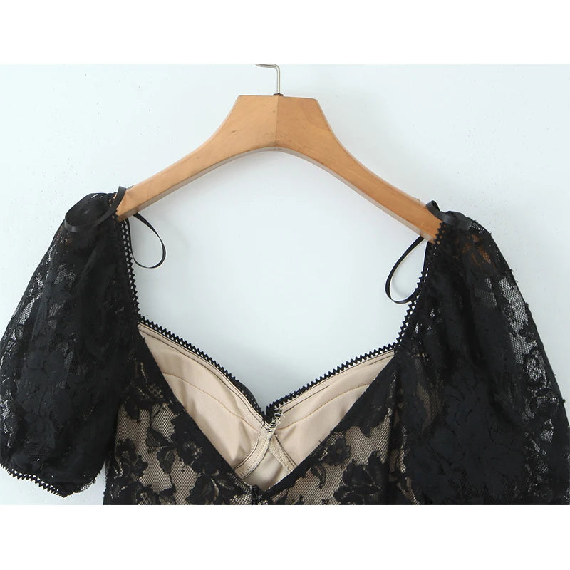 The **Xara Dress** features a beautiful lace design with puffed sleeves and a flattering fit-and-flare silhouette. Perfect for a romantic and vintage-inspired look, it is ideal for special occasions or casual gatherings.
